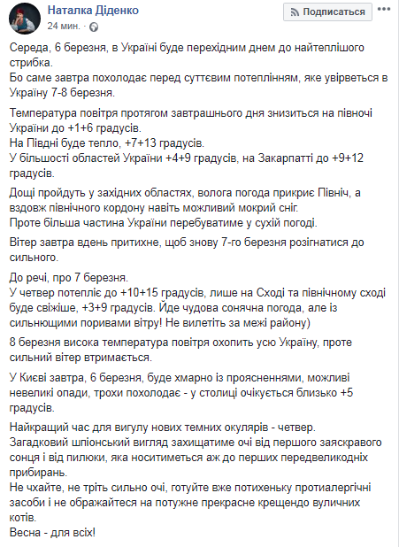 В среду, 6 марта, в Украине ожидается незначительное похолодание перед потеплением, которым 7-8 марта погода порадует украинцев.  Об этом на своей странице в Facebook сообщила синоптик Наталья Диденко.
