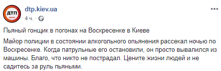 "Пьяный гонщик в погонах на Воскресенке в Киеве. Майор полиции в состоянии алкогольного опьянения рассекал ночью по Воскресенке. Когда патрульные его остановили, он просто вывалился из машины", - говорится в сообщении.