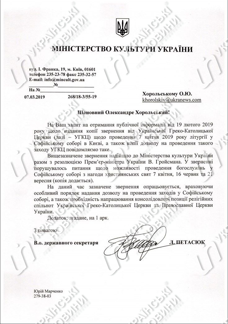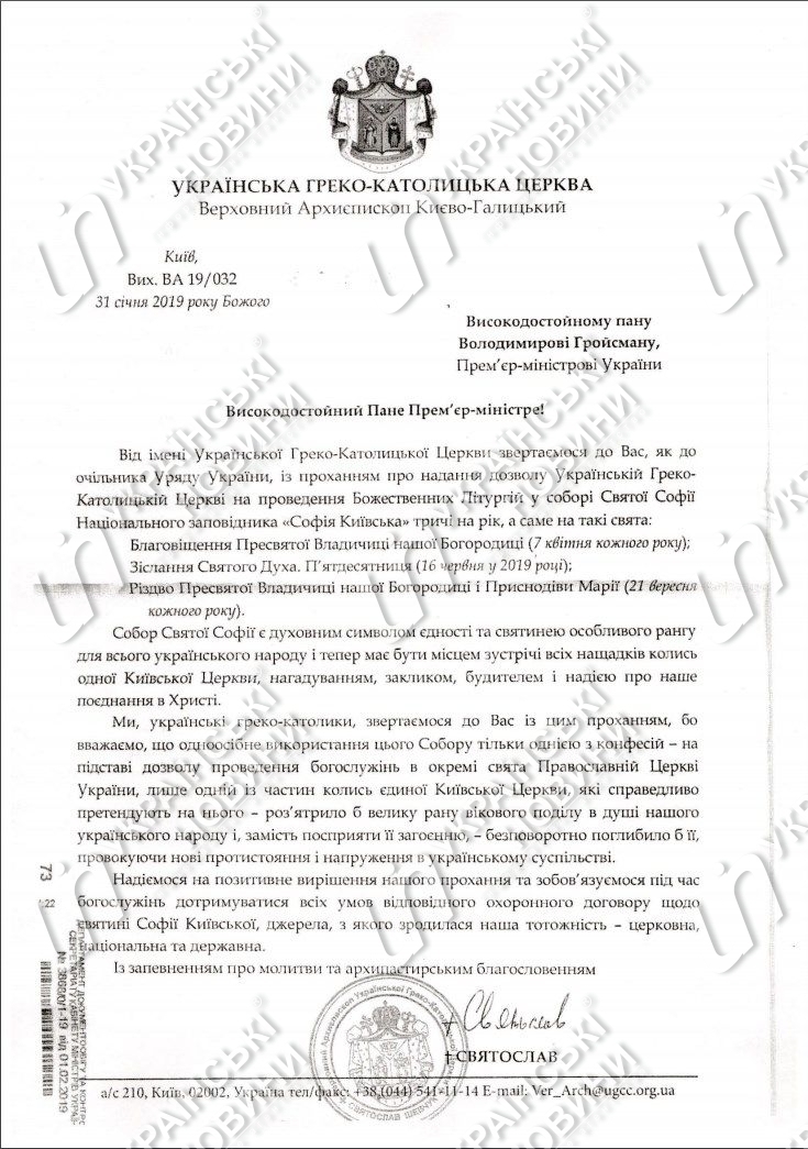 "От имени Украинской греко-католической церкви обращаемся к Вам, как к главе правительства Украины, с просьбой о предоставлении разрешения Украинской греко-католической церкви на проведение божественных литургий в соборе Святой Софии Национального заповедника "София Киевская" 3 раза в год, а именно на следующие праздники: Благовещение Пресвятой Владычицы нашей Богородицы (7 апреля каждого года); Сошествие Святого Духа. Пятидесятница (16 июня в 2019 году); Рождество Пресвятой Владычицы нашей Богородицы и Приснодевы Марии (21 сентября каждого года)", - сказано в письме архиепископа Киево-Галицкого Святослава.
