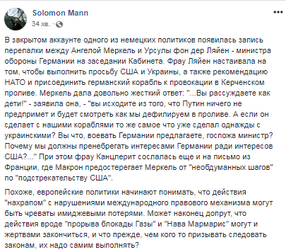 Меркель дала довольно жесткий ответ: "...Вы рассуждаете как дети!" - заявила она, - вы исходите из того, что Путин ничего не предпримет и будет смотреть как мы дефилируем в проливе. А если он сделает с нашими кораблями то же самое, что уже сделал однажды с украинскими? Вы что, воевать Германии предлагаете, госпожа министр? Почему мы должны пренебрегать интересами Германии ради интересов США?...".