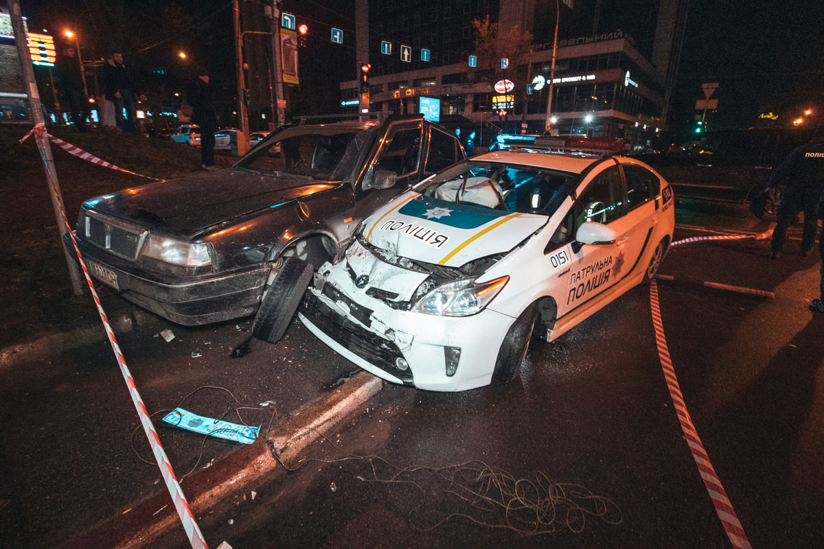 Оказалось, что Lancia была угнана ранее. Полицейские попытались остановить машину, которая проходила по ориентировкам, однако человек за рулем не затормозил и продолжил движение по улице Антоновича в сторону Лыбедской площади.  Перед перекрестком с улицей Загородней патрульные выровнялись с Lancia, но ее водитель резко повернул влево и въехал машину правоохранителей. От удара оба автомобиля вылетели с проезжей части и остановились в парапете.