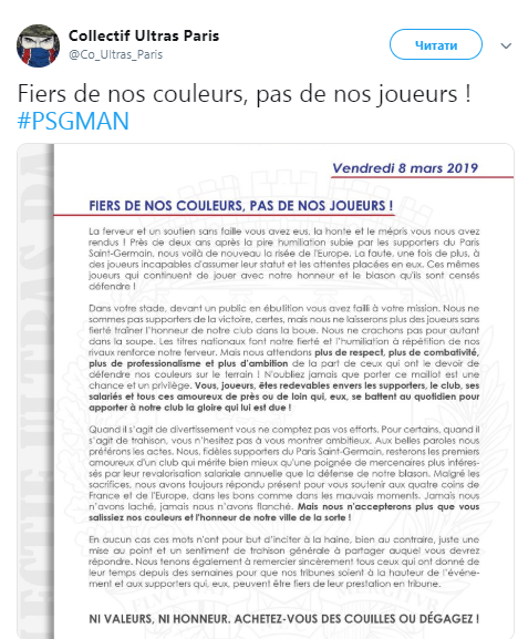 Свои претензии к звездным игрокам парижские ультрас из группировки Collectif Ultras Paris выложили в Twitter.