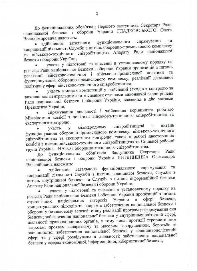 Среди других полномочий Гладковского были: участие в осуществлении мероприятий по контролю за выполнением центральными и местными органами исполнительной власти решений СНБО, введенных в действие указами президента; руководство работой Межведомственной комиссии по политике военно-технического сотрудничества и экспортного контроля; участие в международном сотрудничестве по вопросам функционирования оборонно-промышленного комплекса, военно-технического сотрудничества и экспортного контроля.