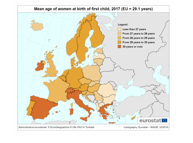 Самый высокий в ЕС средний возраст рождения первого ребенка зафиксирован в Италии (31,1 года). В Испании он составляет 30,9 года, в Люксембурге - 30,8 года, Греции - 30,4 года, Ирландии - 30,3 года, Нидерландах - 29,9 года, на Кипре - 29,7 года.