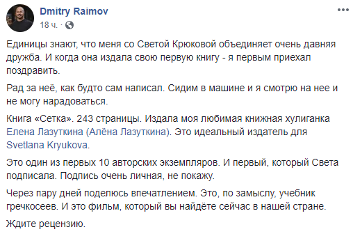 Специалист по кризисным и политическим коммуникациям Дмитрий Раимов одним из первых получил книгу "#Сетка" с автографом автора. "Это один из первых 10 авторских экземпляров. И первый, который Светлана подписала. Подпись очень личная, не покажу. Через пару дней поделюсь впечатлением. Это, по замыслу, учебник гречкосеев. И это фильм, который вы найдёте сейчас в нашей стране. Ждите рецензию", - пообещал Раимов.