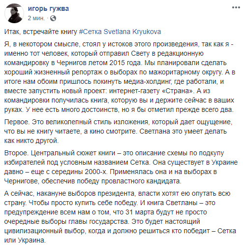 Второе. Центральный сюжет книги – это описание схемы по подкупу избирателей под условным названием Сетка. Она существует в Украине давно – еще с середины 2000-х. Применялась она и на выборах в Чернигове, обеспечив победу провластного кандидата. А сейчас, накануне выборов президента, власти хотят ею опутать всю страну. Чтобы просто купить себе победу. И книга Светланы – это предупреждение всем нам о том, что 31 марта будут не просто очередные выборы главы государства. Это будет настоящий цивилизационный выбор, когда и должно решиться кто победит – Сетка или Украина", - написал Игорь Гужва на своей странице в Facebook.