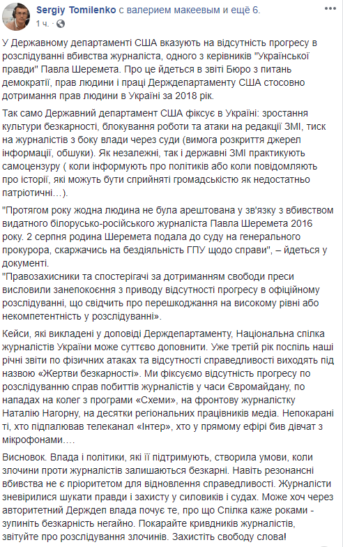 "В течение года ни один человек не был арестован в связи с убийством известного белорусско-российского журналиста Павла Шеремета 2016 года. 2 августа семья Шеремета подала в суд на генерального прокурора, жалуясь на бездействие ГПУ по делу", - говорится в документе.