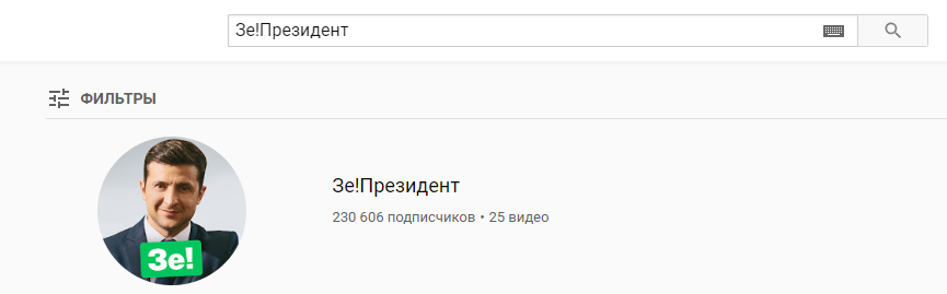 При попытке поиска предвыборного канала Зеленского "Зе! Президент" появляется следующее сообщение: "Эта учетная запись заблокирована из-за неоднократных или грубых нарушений политики YouTube относительно спама, мошенничества, обманчивого содержания или иных отклонений от условий использования".