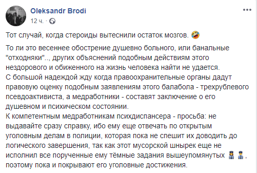 Позже на его сообщение отреагировал сам "исполнитель" заказа Александр Броди. Председатель "Антикоррупции" назвал Рахимова психически нездоровым человеком, у которого "стероиды вытеснили остаток мозгов", и списал все на "весеннее обострение душевно больного, или банальный "отходняк". Кроме того, он понадеялся, что правоохранительные органы дадут правовую оценку подобным заявлениям "балабола".