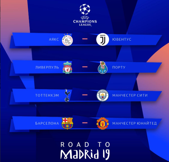В полуфиналах сыграют победители пары Тоттенхэм - Манчестер Сити и Аякс - Ювентус и пары Барселона - Манчестер Юнайтед и Ливерпуль - Порту.