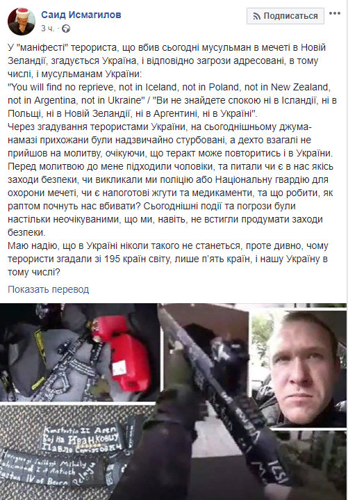 "В "манифесте" террориста, убившего сегодня мусульман в мечети в Новой Зеландии, упоминается Украина, и соответственно угрозы адресованы, в том числе, и мусульманам Украины", – отметил Исмагилов.