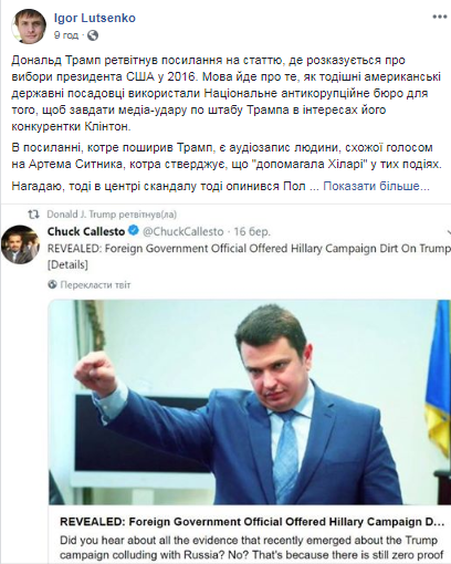 "В ссылке, которую распространил Трамп, есть аудиозапись человека, с голосом похожим на голос Артема Сытника, который утверждает, что "помогал Хилари" в тех событиях.