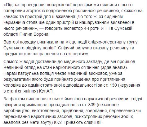 На место происшествия вызвали следственно-оперативную группу. Указанное вещество и предметы изъяли для направления на экспертизу. Водителя же доставили в медучреждение, где он сдал анализ на наркотики. Теперь патрульная полиция ждет медицинское заключение. По его результатам будет принято решение о привлечении мужчины к административной ответственности. Также по факту обнаружения у него вероятно наркотического вещества, следователи открыли уголовное производство. Следственные действия продолжаются.