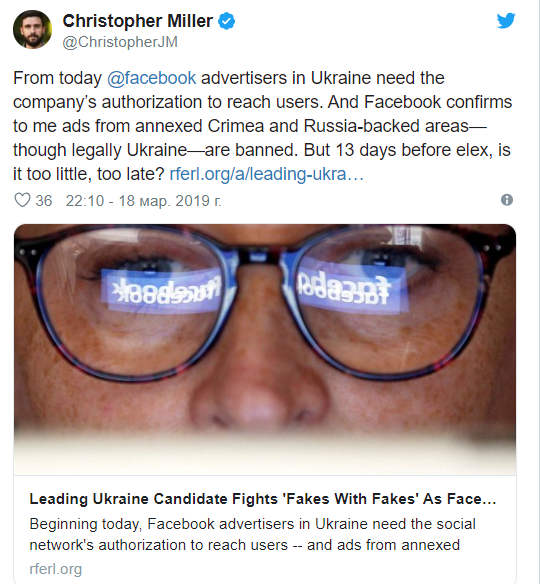 Отметим, что нововведения стартовали за 13 дней до выборов президента Украины. Миллеру также подтвердили в Facebook, что посты с аннексированного Крыма и областей, поддерживаемых Россией, банятся, хотя оккупированные территории официально признаны украинскими.