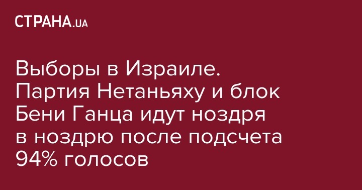 Партия "Ликуд" премьер-министра Биньямина Нетаньяху и центристский блок партий "Кахоль-Лаван" ("Бело-голубые", назван по цветам израильского флага) бывшего главы Генштаба Бени Ганца практически сравнялись по количеству мест, которое они получат в Кнессете (парламенте страны) 21-го созыва после подсчета 94% голосов на состоявшихся во вторник парламентских выборах в Израиле . Об этом сообщает ТАСС со ссылкой на государственное радио Израиля Kan.