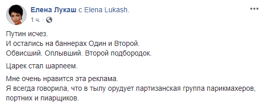 "Путин исчез. И остались на баннерах Один и Второй. Обвисший. Оплывший. Второй подбородок. Царек стал шарпеем. Мне очень нравится эта реклама. Я всегда говорила, что в тылу орудует партизанская группа парикмахеров, портних и пиарщиков", - прокомментировала новый борд юрист, экс-министр юстиции Елена Лукаш.