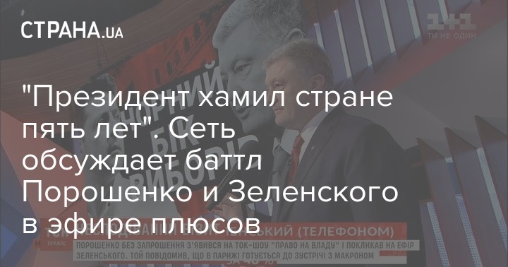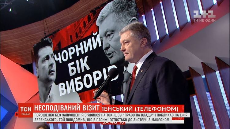 Вечером 11 апреля Петр Порошенко внезапно нагрянул на "1+1", где поругался в прямом эфире по телефону с Владимиром Зеленским. Тот в это время был в Париже, куда его на встречу пригласил президент Франции Эммануэль Макрон. Петр Порошенко скорее всего знал об этом, его также пригласили на встречу с Макроном в пятницу, но позже, чем с Зеленским. Однако он заочно позвал своего оппонента в студию "Плюсов" и дал 40 минут, требуя дебатов прямо здесь и сейчас.