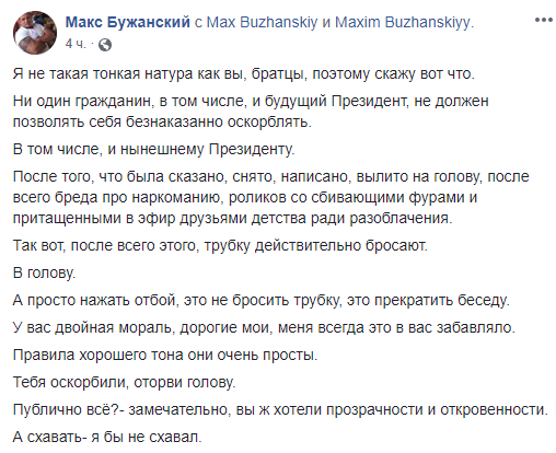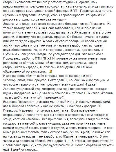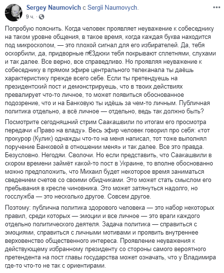 "Попробую пояснить. Когда человек проявляет неуважение к собеседнику на таком уровне общения, в такое время, когда каждая буква находится под микроскопом, - это плохой сигнал для его избирателей. Да, тебя оскорбили, да, придворные п€3дюки тебя покрывают сплетнями, слухами и так далее. Все верно, все справедливо. Но проявляя неуважение к собеседнику в прямом эфире центрального телеканала ты даёшь характеристику прежде всего себе. Если ты претендуешь на президентский пост и демонстрируешь, что в твоих действиях превалирует что-то личное, то может появиться обоснованное подозрение, что и на Банковую ты идёшь за чем-то личным. Публичная политика отдельно, а всё личное — отдельно, ведь так должно быть?