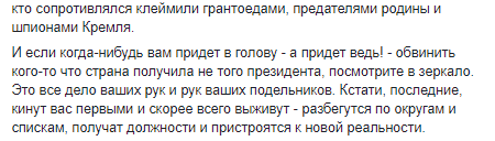 И если когда-нибудь вам придет в голову - а придет ведь! - обвинить кого-то что страна получила не того президента, посмотрите в зеркало. Это все дело ваших рук и рук ваших подельников. Кстати, последние, кинут вас первыми и скорее всего выживут - разбегутся по округам и спискам, получат должности и пристроятся к новой реальности".