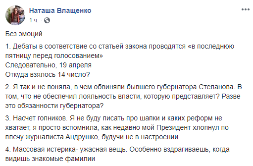 Журналист и ведущая Наталья Влащенко после эфира задалась вопросом, откуда взялась дата дебатов 14 апреля и в чем собственно президент обвиняет экс-губернатора Одесской области Максима Степанова, назначение которого он назвал ошибкой.