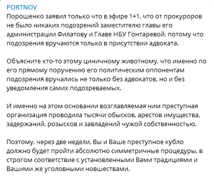 "Порошенко заявил только что в эфире 1+1, что от прокуроров не было никаких подозрений заместителю главы его администрации Филатову и Главе НБУ Гонтаревой, потому что подозрения вручаются только в присутствии адвоката.
