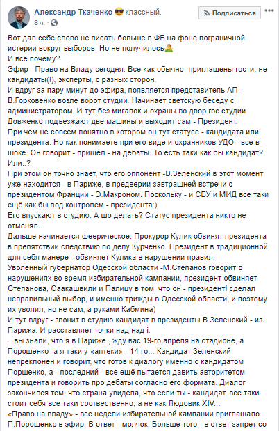 Дальше начинается феерическое. Прокурор Кулик обвинят президента в препятствии следствию по делу Курченко. Президент в традиционной для себя манере - обвиняет Кулика в нарушении правил. Уволенный губернатор Одесской области - Степанов говорит о нарушениях во время избирательной кампании, президент обвиняет Степанова, Саакашвили и Палицу в том, что он - президент - сделал неправильный выбор, и именно трижды в Одесской области, и поэтому их уволил, но не сам, а руками Кабмина. И тут вдруг звонит в студию в президенты Зеленский - из Парижа. И расставляет точки над над і", - написал Ткаченко.