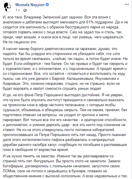 Нардеп от БПП Мустафа Найем сравнил Зеленского с девятиклассником за гаражами, на фоне которого Порошенко выглядел достойнее. Но поддержку избирателей президент теряет из-за неприкрытого дерибана хапуг, а хамство стало нормой общения за пять лет.