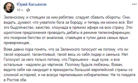 Волонтер Юрий Касьянов написал, что не то, чтобы Зеленского так любят. просто Порошенко надоел до чертиков и посоветовал Зеленскому вести себя все же как кандидату в президенты большой европейской страны.
