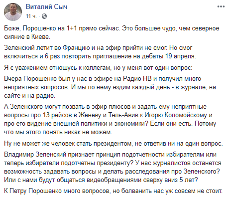 Главред "Нового времени" Виталий Сыч написал, что Порошенко в студии 1+1 удивительно, но почему Владимиру Зеленскому не задали вопросы о его поездки в Женеву и Тель-Авив, где проживает Игорь Коломойский.