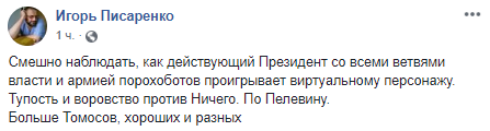 "Смешно наблюдать, как действующий Президент со всеми ветвями власти и армией порохоботов проигрывает виртуальному персонажу. Тупость и воровство против Ничего. По Пелевину. Больше Томосов, хороших и разных".