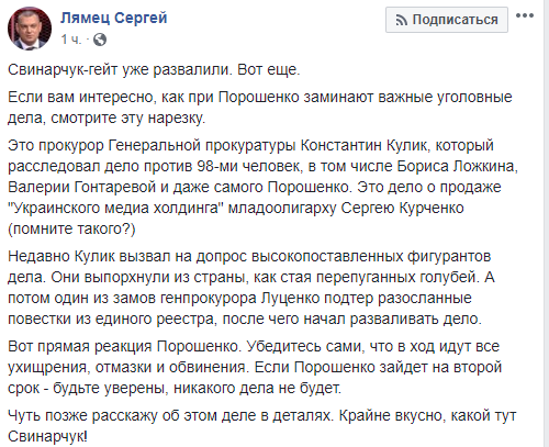 "Свинарчук-гейт уже развалили. Вот еще. Если вам интересно, как при Порошенко заминают важные уголовные дела, смотрите эту нарезку.