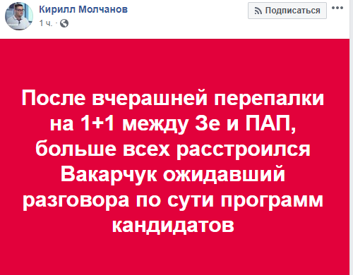 Политический эксперт Кирилл Молчанов вспомнил о несостоявшемся кандидате Святославе Вакарчуке: "После вчерашней перепалки на 1+1 между Зе и ПАП, больше всех расстроился Вакарчук ожидавший разговора по сути программ кандидатов".