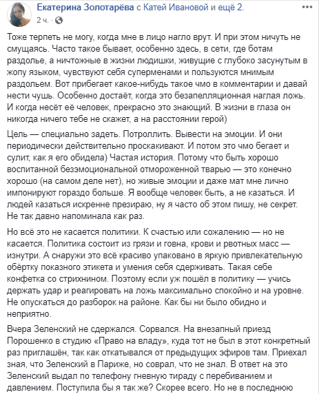 Вчера Зеленский не сдержался. Сорвался. На внезапный приезд Порошенко в студию "Право на владу", куда тот не был в этот конкретный раз приглашён, так как откатывался от предыдущих эфиров там. Приехал зная, что Зеленский в Париже, но соврал, что не знал. В ответ на это Зеленский выдал по телефону гневную тираду с перебиванием и давлением. Поступила бы я так же? Скорее всего. Но не в последнюю предвыборную неделю, когда на кону стоит слишком многое.