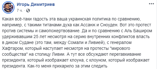 "Какая всё-таки гадость эта ваша украинская политика по сравнению, например, с такими титанами духа как Ассанж и Сноуден. Вот это протест против системы и самопожертвование. Да и по сравнению с Аль Баширом удерживавшим 25 лет несмотря на серию внутренних конфликтов власть в диком Судане (это там, между Сомали и Ливией), с генералом Хафтаром, который наступает несмотря на протесты "мирового сообщества" на столицу Ливии. А тут все обсуждают перегавкивание президента, который изображает клоуна, с клоуном, который изображает президента. Как-то меня прихарило за этим следить".