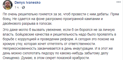 "Пп очень решительно гоняется за зе, чтоб провести с ним дебаты. Прям боец. Не сдается на фоне разгромно проигранной кампании и двойного разрыва в голосах.