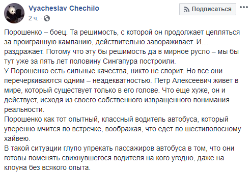 Журналист Вячеслав Чечило сравнил Петра Порошенко с водителем автобуса, который уверенно мчится по встречке, воображая, что едет по шестиполосному хайвею.