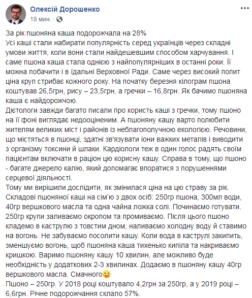 За год пшенная крупа в Украине подорожала на 28%. В рационе наших людей в целом каши стали набирать популярность. Потому что они стали самым дешевым способом питания. Однако, именно пшенная каша стала одной из самых популярных в последние годы. Ее можно увидеть и в столовой Верховной Рады.