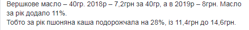 Сливочное масло - 40 грамм. В 2018 году оно стоило 7,2 грн за 40 грамм, а в 2019 году - 8 грн. Масло за год подорожало на 11%.