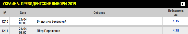Хотя еще в среду, 10 апреля, речь шла о ставке на действующего президента 3.50. При ставке 100 гривен прибыль составляет 250 гривен.