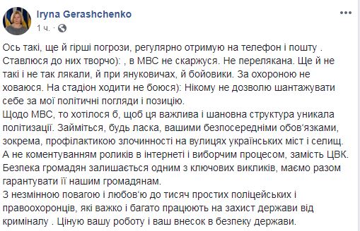 Первый заместитель председателя Верховной Рады Ирина Геращенко, активно поддерживающая действующего президента Петра Порошенко, сообщила, что регулярно получает на электронную почту и телефон угрозы, но не жалуется в МВД. Об этом она заявила в Facebook.