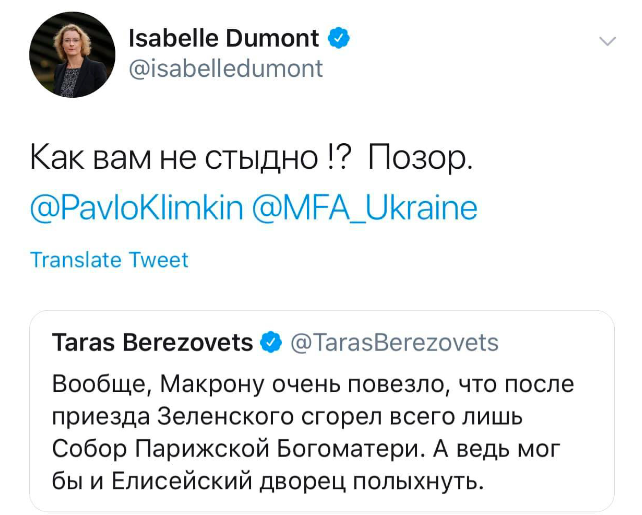 "Как вам не стыдно??!! – написала посол Франции по поводу очередного идиотского замечания Березовца.