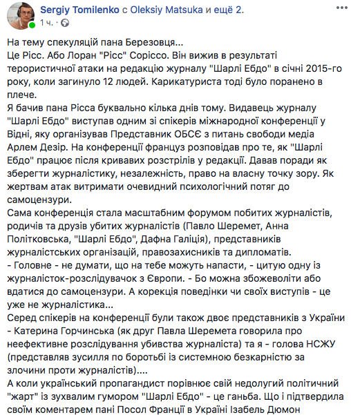 Глава Национального союза журналистов Украины Сергей Томиленко назвал пост Березовца "ганьбой":