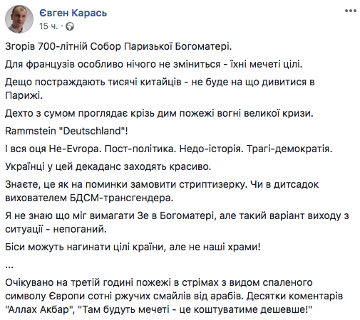 "Действовали системно, нагло, открыто. Можете убедиться в этом сами. Уже совсем скоро с этой жесткой реальностью предстоит столкнуться любому из вас, кто посмеет высказать толику критики в адрес г-на Зеленского... Что до Парижского собора, его потеря является безусловной трагедией для мировой культуры, и я скорблю о его утере вместе со всей французской нацией. Я не имел намерения обидеть ничьи чувства и приношу свои извинения всем, кого оскорбила моя неудачная шутка. Собор в моем посте был всего лишь неудачной метафорой, и поэтому я удаляю свою неоднозначную шутку из прошлого поста", – заявил Березовец.