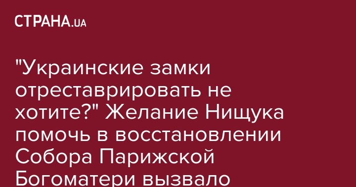 Министр культуры Украины Евгений Нищук в связи с масштабным пожаром в Соборе Парижской Богоматери выразил сожаление и заявил, что Украина готова отправить лучших специалистов во Францию, чтобы те поучаствовали в восстановлении культурного памятника. Об этом он написал на своей странице в Facebook.