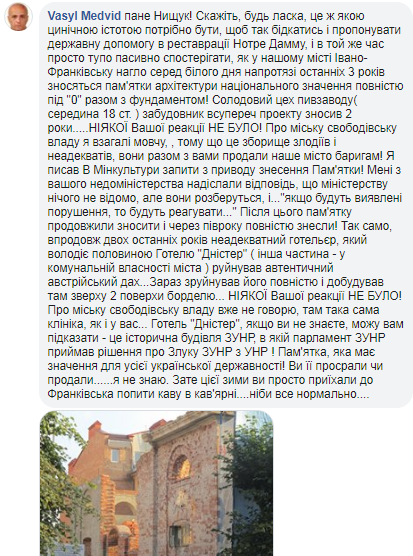 Пользователи также забросали министра целым огромным списком неотреставрированных объектов культурного наследия Украины: это и старинный цех пивзавода в Ивано-Франковске, и Червоноградский замок в Тернопольской области, и Невицкий замок, и многие другие.