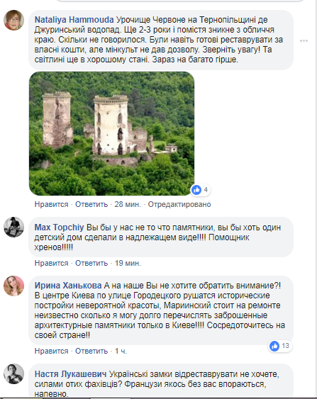 "Украинские замки отреставрировать не хотите, силами тех специалистов? Французы как-то без вас справятся, наверное", - написала Настя Лукашевич.