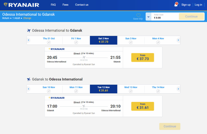 Полеты начнут выполняться с 29 октября два раза в неделю по вторникам и субботам. Вылеты из Одессы в 20:45, вылеты из Гданьска в 17:00. Время в пути составит 2 часа 10 минут. В системе указано, что фактическим перевозчиком на маршруте будет выступать польская дочка Ryanair - Ryanair Sun.