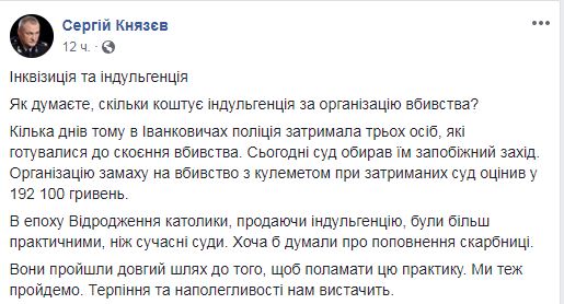 "Как думаете, сколько стоит индульгенция за организацию убийства? Несколько дней назад в Иванковичах полиция задержала трех человек, которые готовились к совершению убийства. Сегодня суд избирал им меру пресечения. Организацию покушения на убийство с пулеметом при задержанных суд оценил в 192 100 гривен", - сообщил Князев.