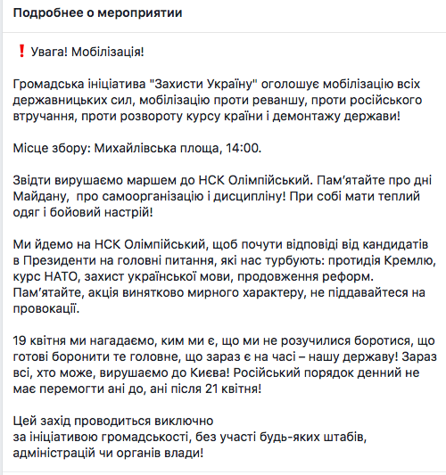 "Помните о днях Майдана, о самоорганизации и дисциплине! При себе иметь теплую одежду и боевой настрой! Мы идем на НСК Олимпийский, чтобы услышать ответы от кандидатов в президенты на главные вопросы, которые нас беспокоят: противодействие Кремлю, курс НАТО, защиту украинского языка, продолжения реформ. Помните, акция исключительно мирный характер, не поддавайтесь на провокации", - указывается в анонсе на Facebook.