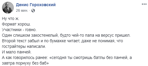 "Ну что ж. Формат хорош. Участники - говно. Один слишком закостенелый, будто чей-то папа на версус пришел. Второй текст забыл и по бумажке читает, даже не понимая, что гострайтеры написали. И мало панчей. А как говорилось ранее: "сегодня ты смотришь батлы без панчей, а завтра порнуху без баб", - написал политэксперт и блогер Денис Гороховский.